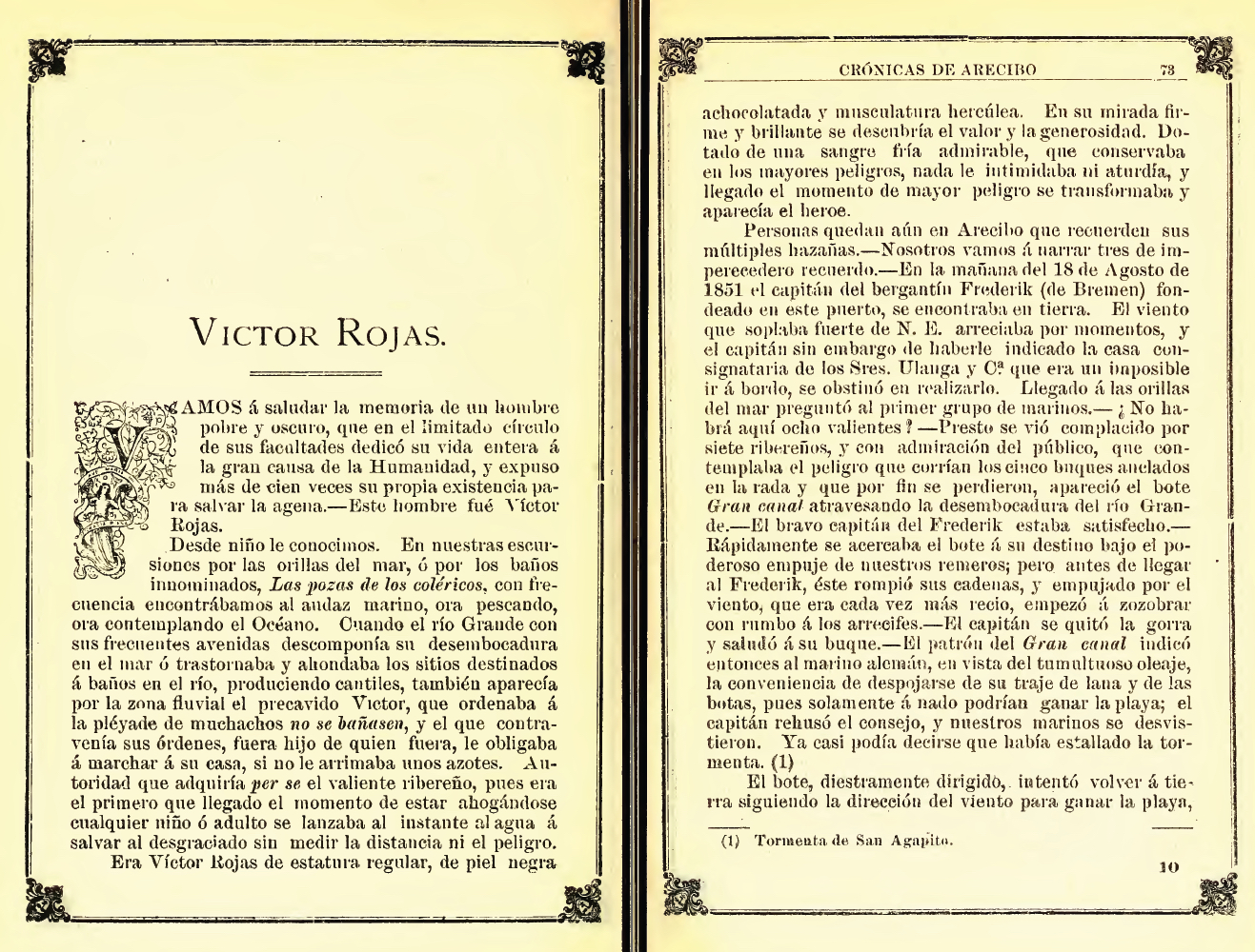 A Víctor Rojas se le atribuyeron muchos salvamentos y grandes proezas como nadador y rescatista. No he explorado su presencia en las voces populares, pero sí recuerdo que mi madre, Carmen Emilia Pizzini, me contaba sobre las hazañas de Rojas, protagonizando sus brazadas en el agitado mar arecibeño, según se lo contó su padre, natural de ese pueblo.